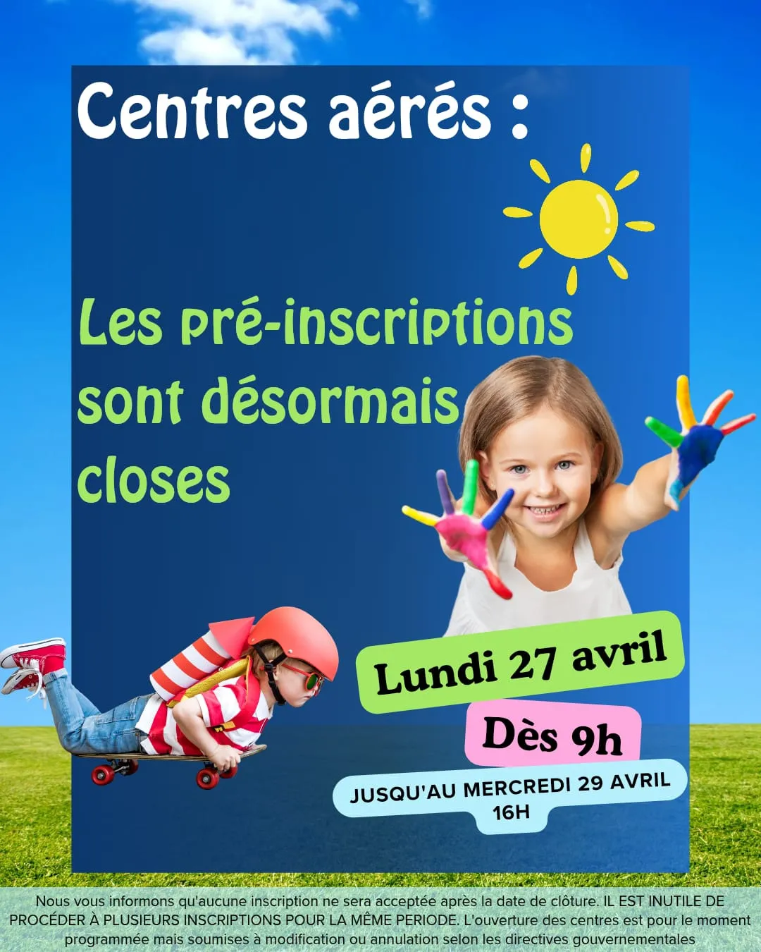 FERMETURE DES PRE-INSCRIPTIONS EN LIGNE POUR LES CENTRES AERES POUR LES VACANCES D'ETE