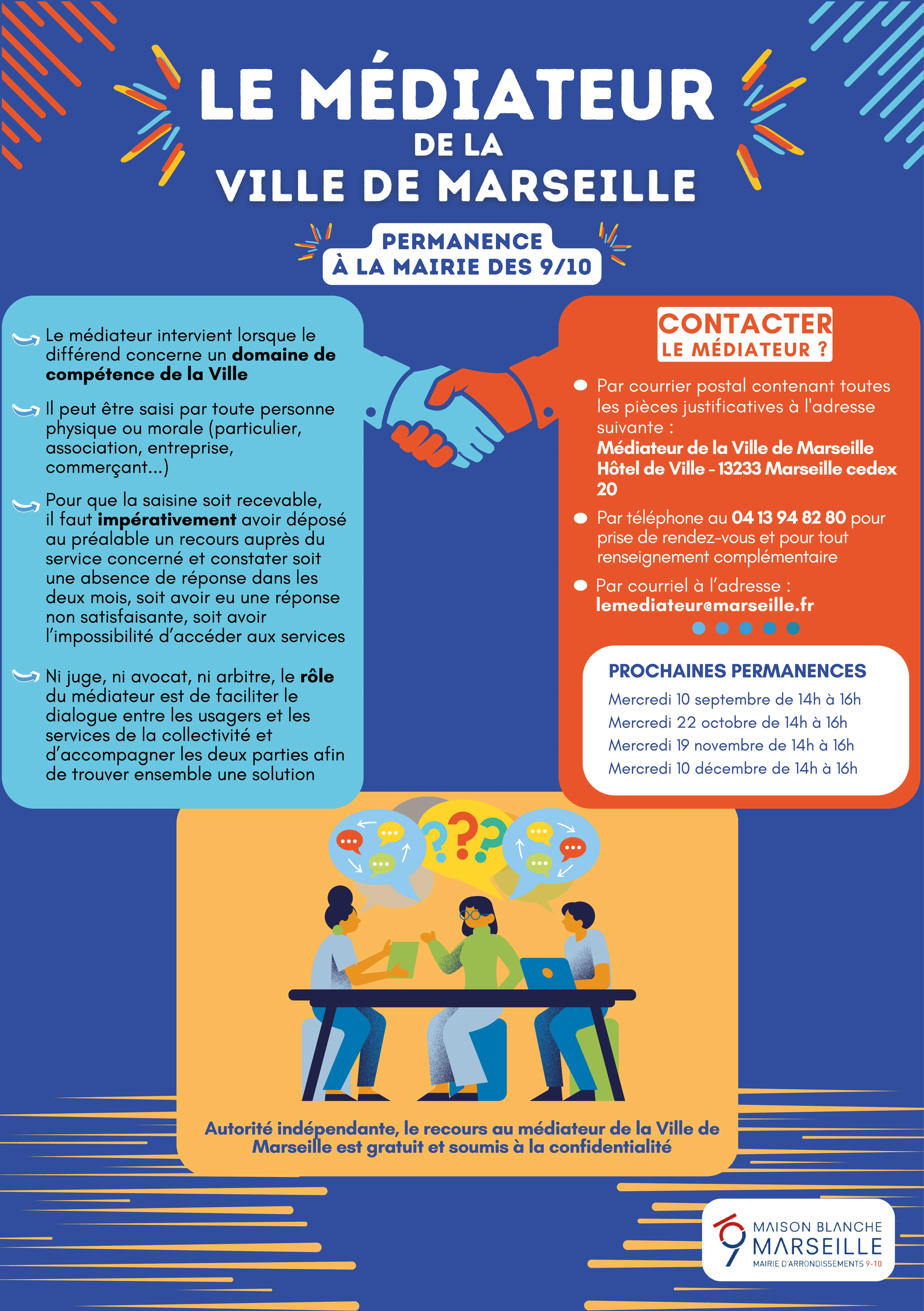 Submitted by gestionnaire@m… on mar 12/08/2025 - 11:42 MEDIATEUR VILLE DE MARSEILLE Rendez-vous Mardi 12 août 202514:00 - 16:00Mairie Maison Blanche150 Bd Paul Claudel, 13009 Marseille Vignette